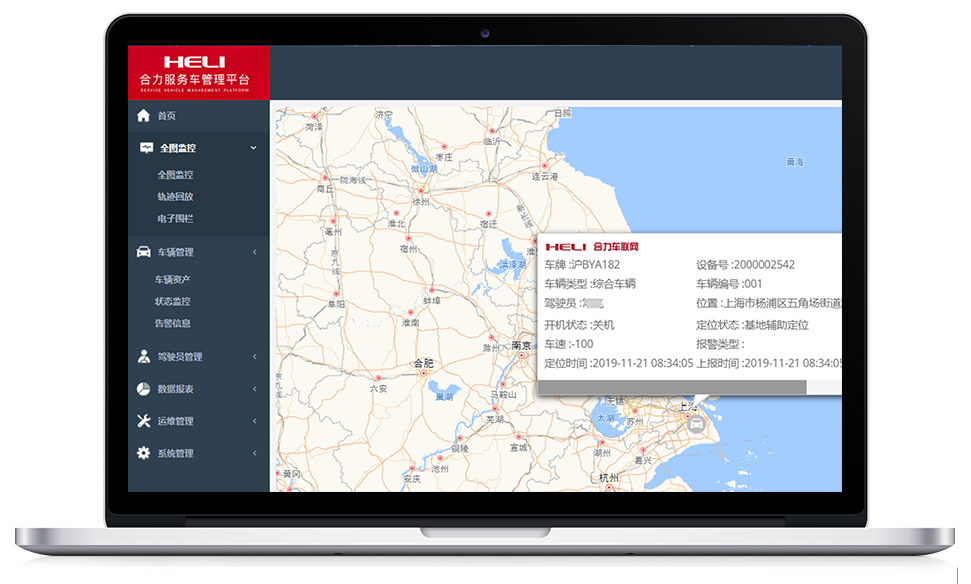 所属组织车辆实时定位跟踪,监控车辆的实时位置信息、车辆开关机状态、车速、定位状态、故障告警等。随时了解车辆的行踪,全面掌握车队的运行状态。